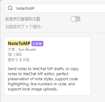 通过Obsidian设置——第三方插件——社区插件市场,输入NoteToMP搜索安装。