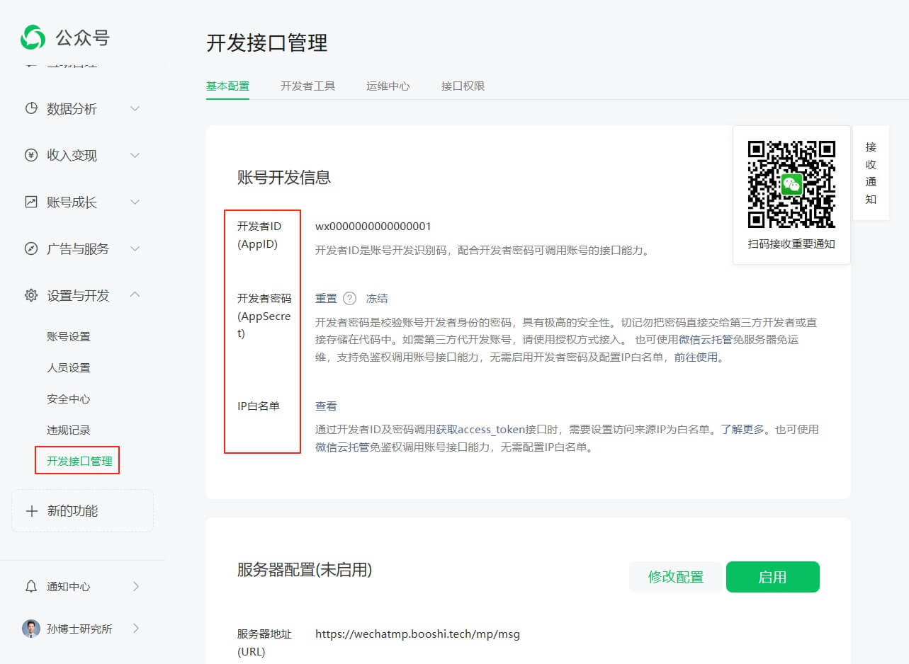 1)获取开发者ID(AppID)和开发者密码(AppSecret) ⚠️由于AppID现在是严格大小写匹配,请务必仔细检查,另外目前AppID基本都是wx开头的,也可以作为检查的依据。 通过设置与开发——开发接口管理——帐号开发信息获取