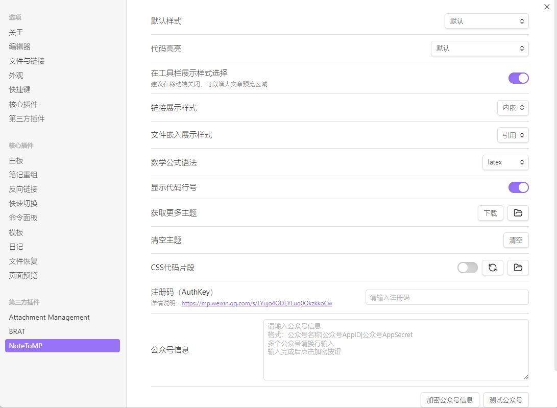 - 打开Obsidian设置——NoteToMP——注册码,输入复制的注册码即可
